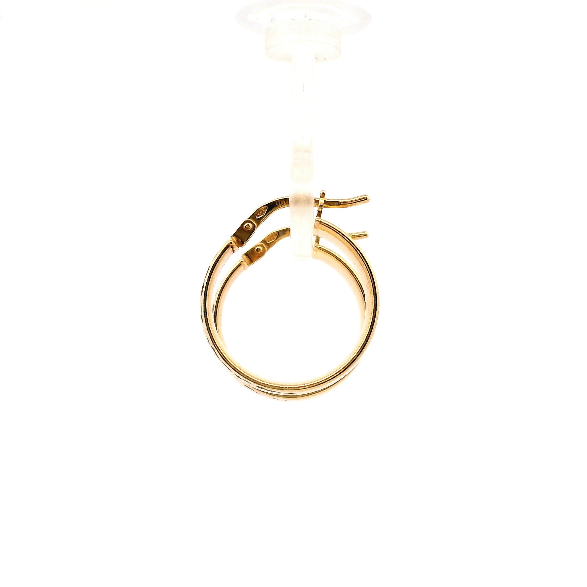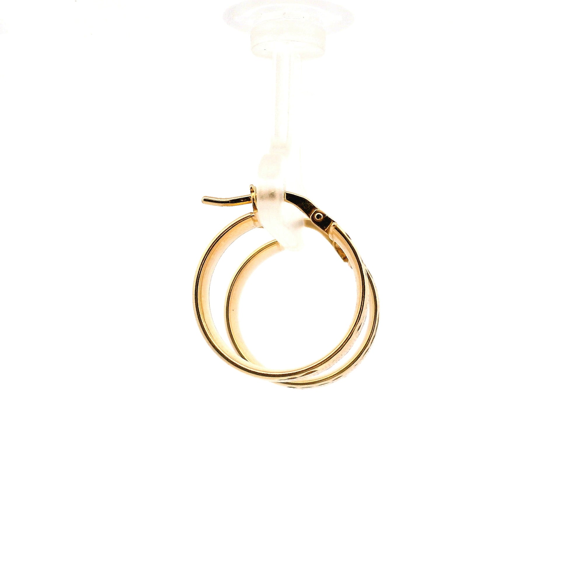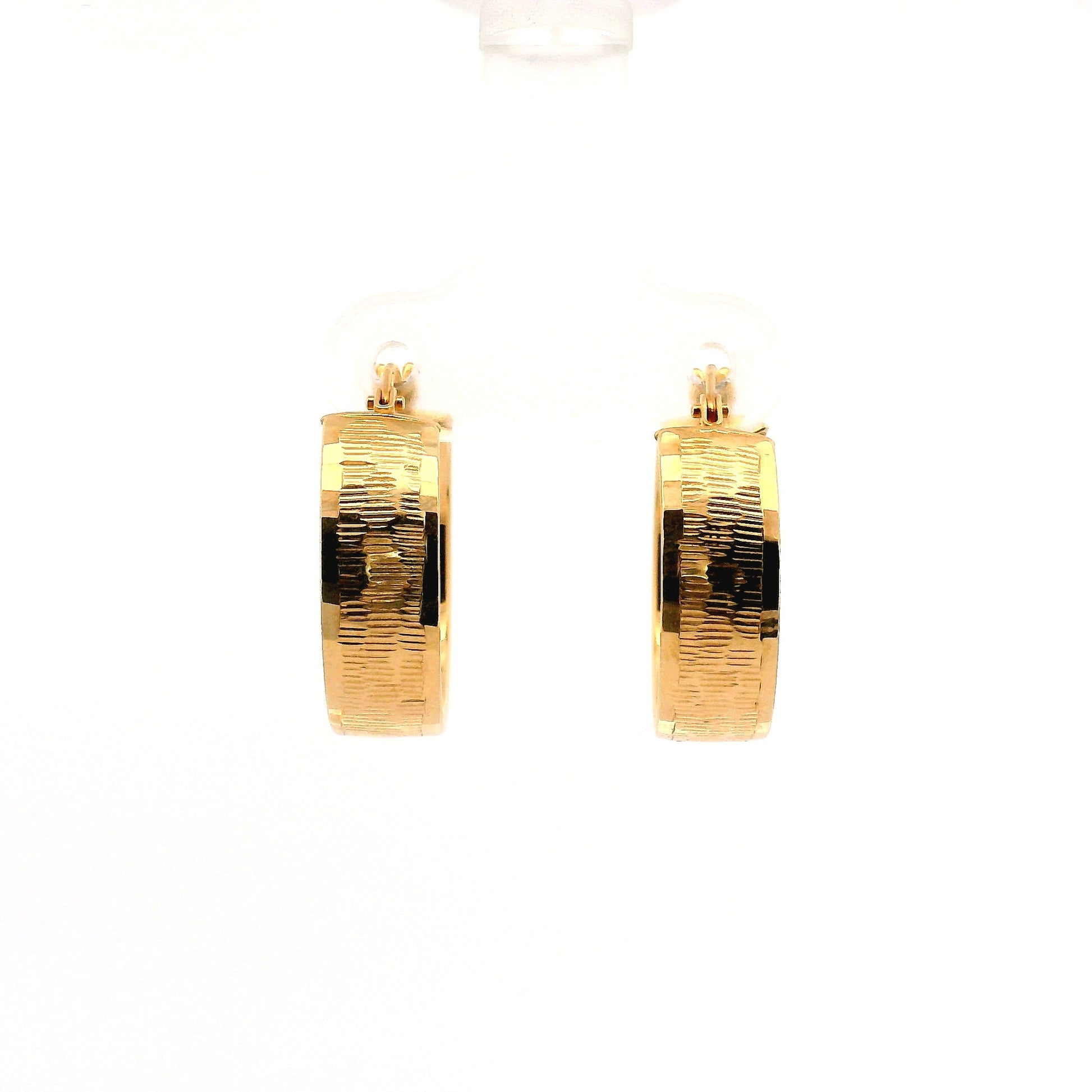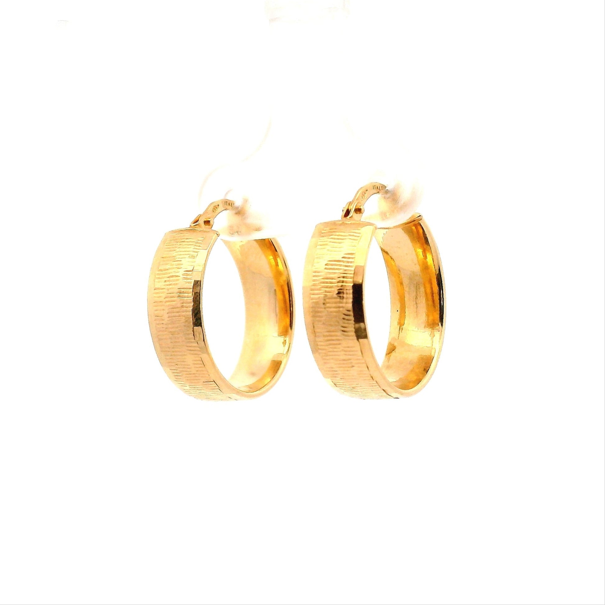 עגילי חישוק מזהב 14 קראט בעיצוב אלגנטי עם טקסטורה מעודנת וייחודית המעניקה עומק וברק יוקרתי. השילוב בין רוחב בולט לעיטור מחוספס יוצר מראה מרשים ונוכח